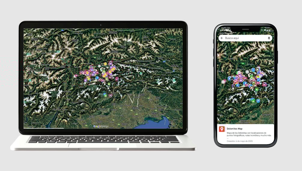 When you get the map, you'll receive an email with a link to access the map and an exclusive guide with everything you need to know before traveling to the Dolomites. Must-have apps, routes divided by difficulty, how to get there, best season to visit, and much more. You don't need a Google account to open it, but if you do use your account, it will be automatically saved. You can access the map from your phone or tablet via the Google Maps app or from your computer through Google Maps in your browser.